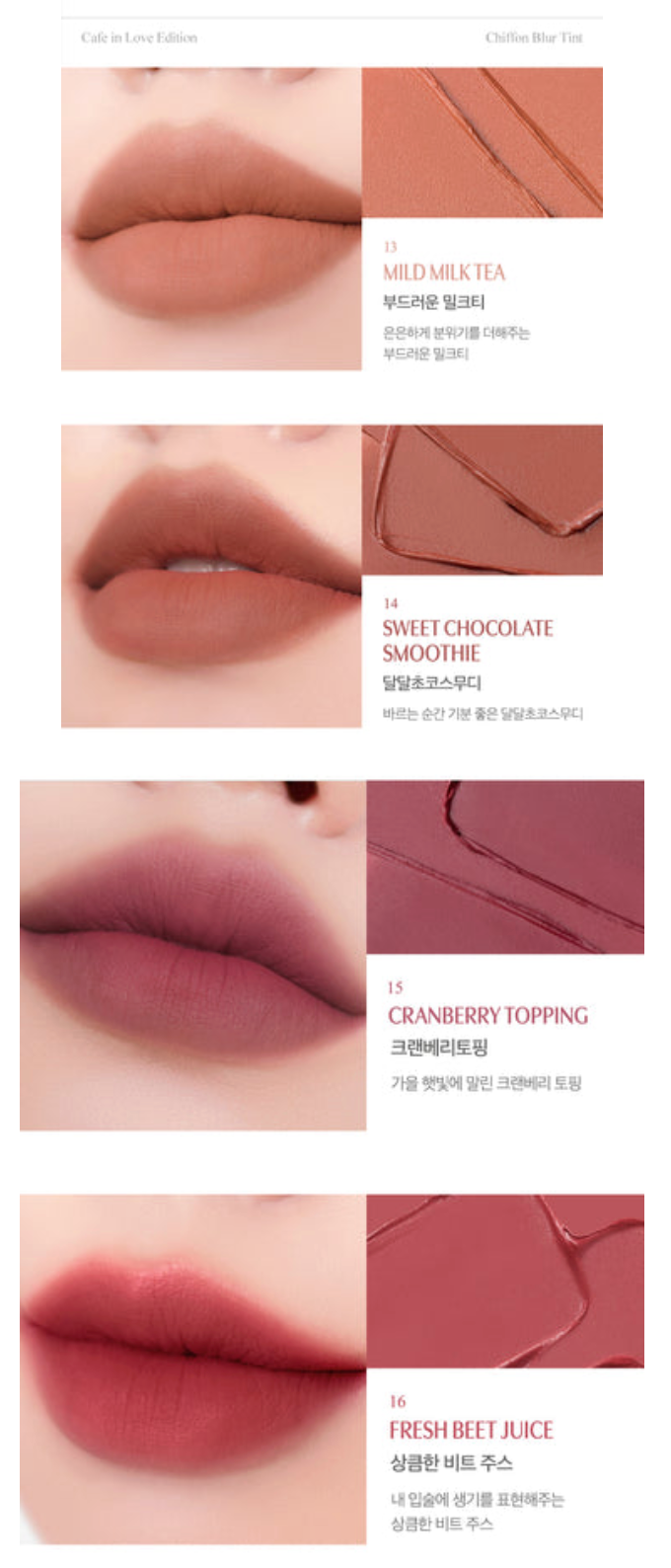 Pucker up with this long-lasting velvety lip tint that offers a blurring effect for a dreamy lip look. The lightweight texture spreads on lips smoothly and adheres well without clumping.