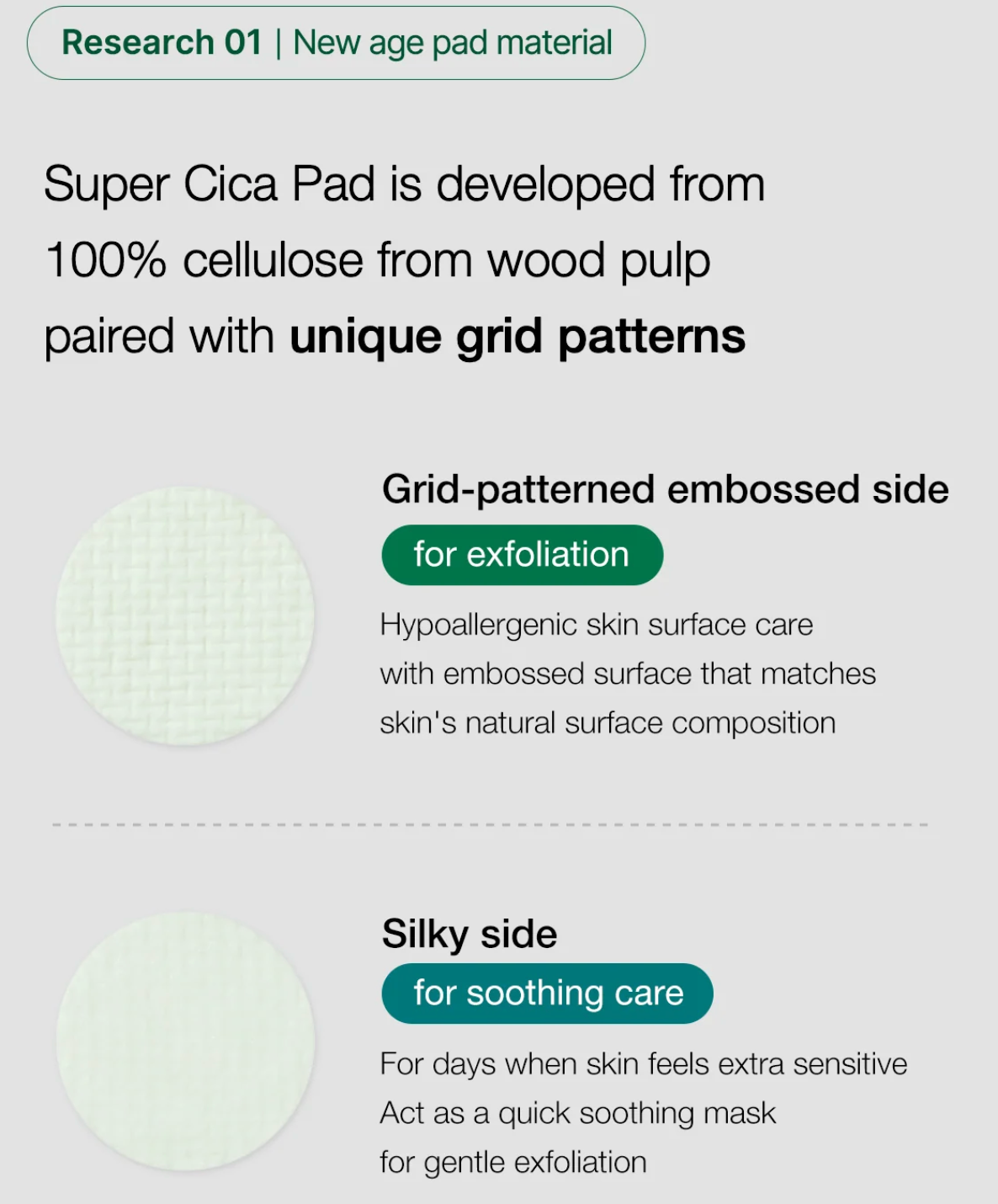 SUPER soothing, REAL Cica, Low-irritating toner pads. Formulated with 88% Centella asiatica extract. This mild soothing toner pad helps to soothe sensitive skin while giving hydration.