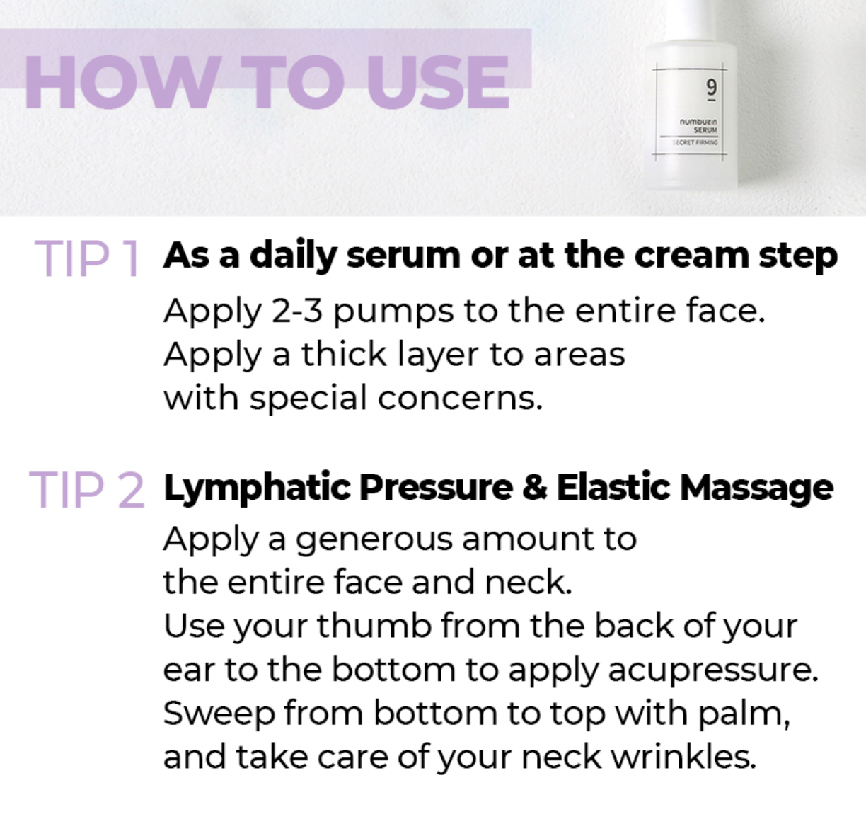 Numbuzin No.9 Secret Firming Serum: rejuvenate and reduce the appearance of fine lines and wrinkles. Packed with peptides for a smooth youthful looking skin. Its creamy texture is smooth and readily absorbed by skin.