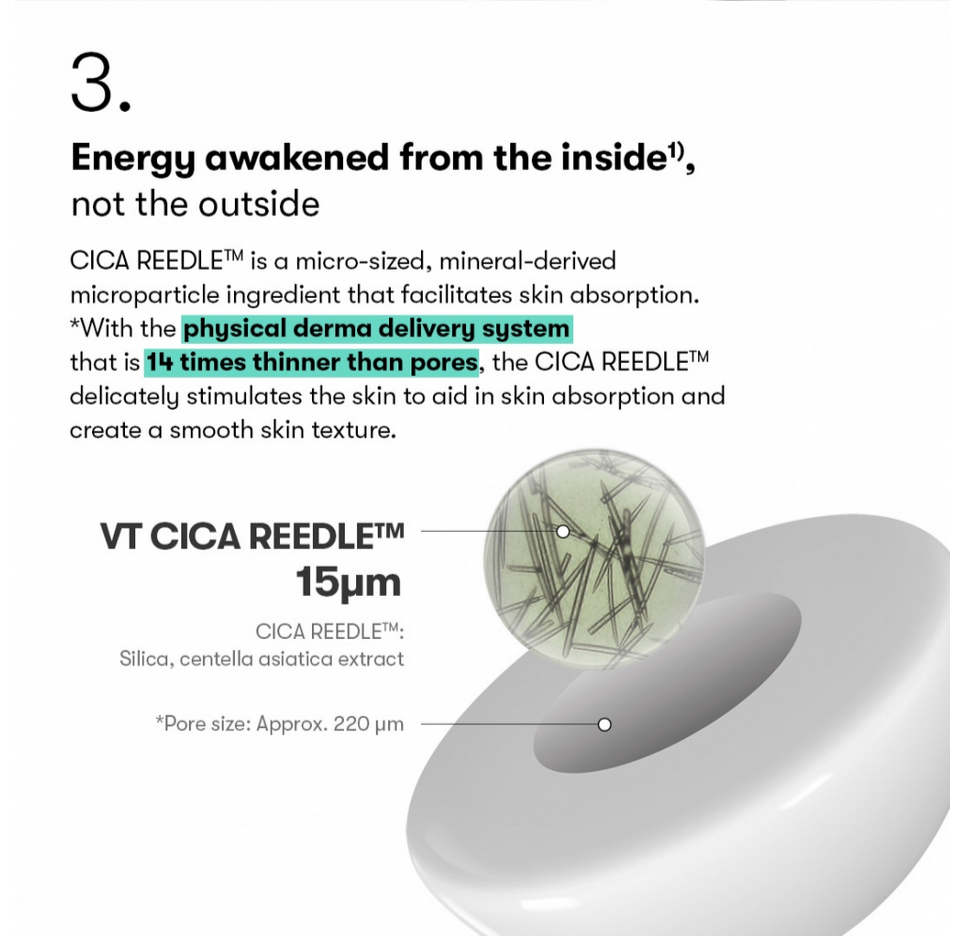 Boost skin elasticity, replenish moisture levels and calm inflammation with this do-it-all skin treatment infused with low-molecular-weight PHYTO PDRN®PANAX, hyaluronic acid and centella asiatica extract. Thanks to VT’s innovative skin care technology Cica Reedle™, the revitalizing ampoule absorbs deeply into skin, leaving it radiant and smooth.